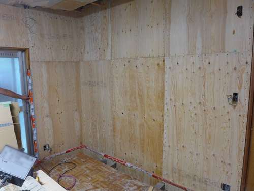 居間は耐震金具取り付け、構造用合板、PB、クロスで仕上げ。